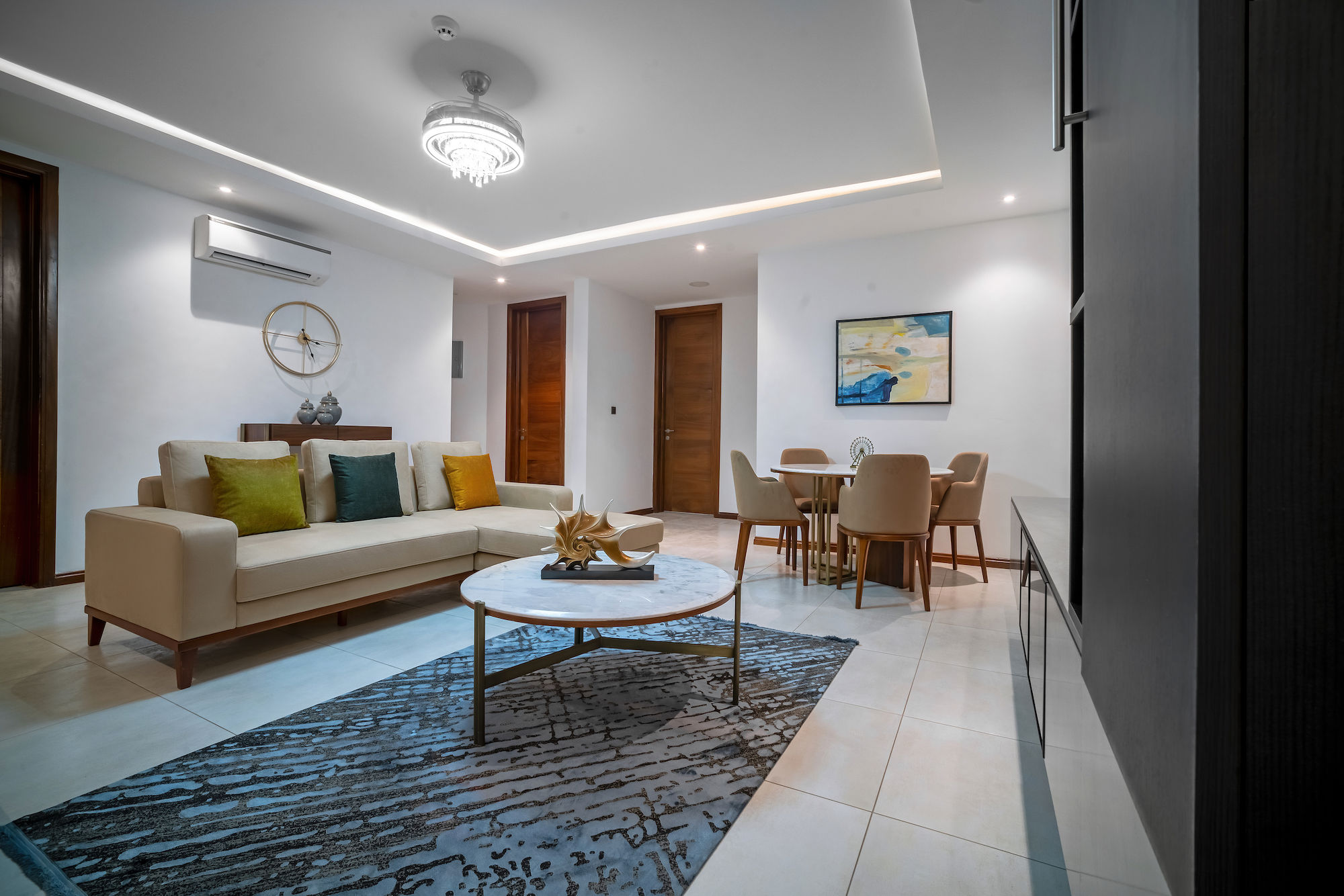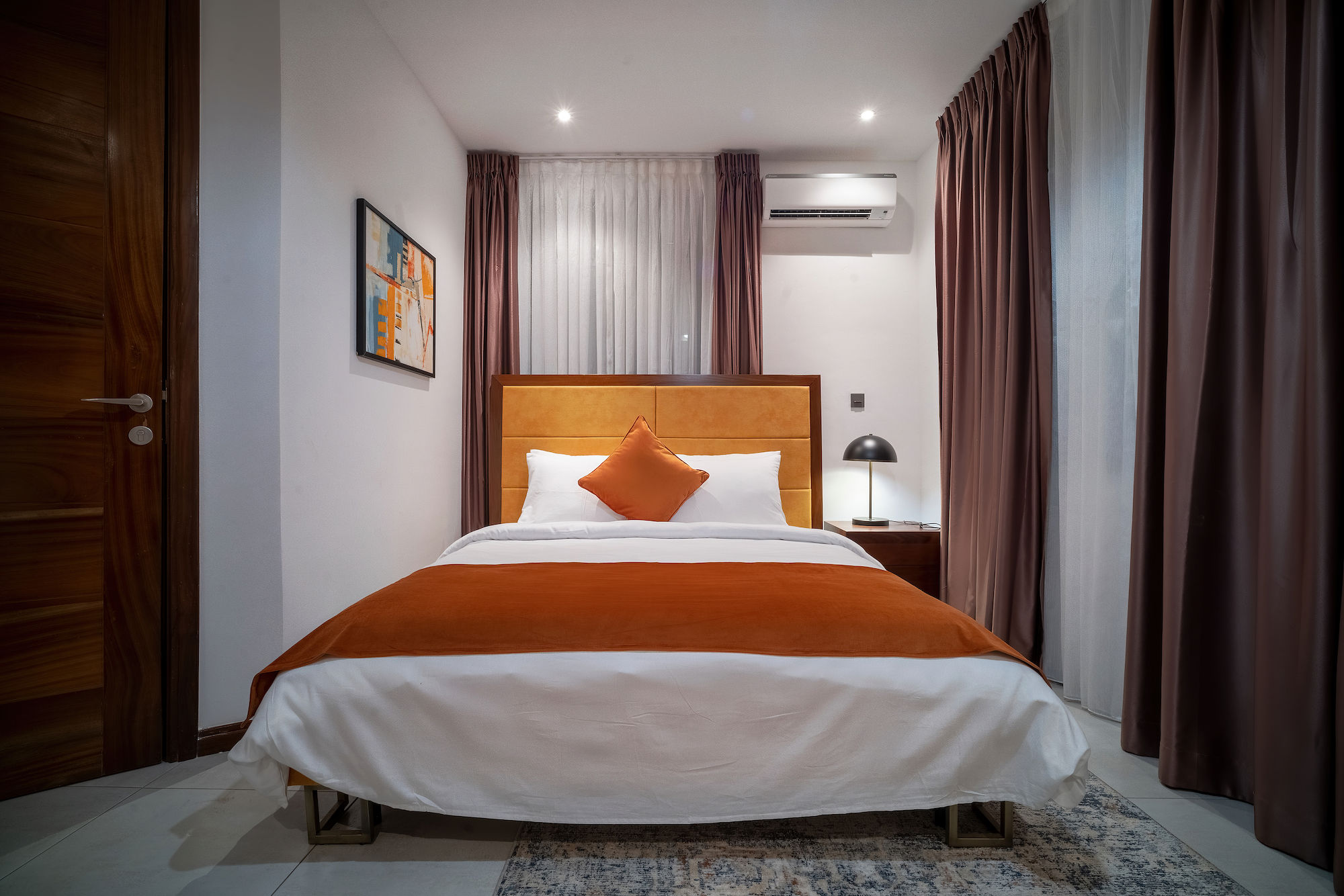 A three-bedroom apartment with a different executive suite bedroom that has a Queen size bed, a deluxe room with a double bed and a deluxe room with twin beds. It is fitted with a fully equipped ultra-modern kitchen and a huge living room and dining area for your family and friends. The apartment is fully air-conditioned with internet access, smart Tv, kitchen, fridge, Microwave, crockery, oven, stove, kettle, blender, washing machine, kitchen utensils, iron and ironing board, wardrobe, clothes hangers, toiletries, porch, and