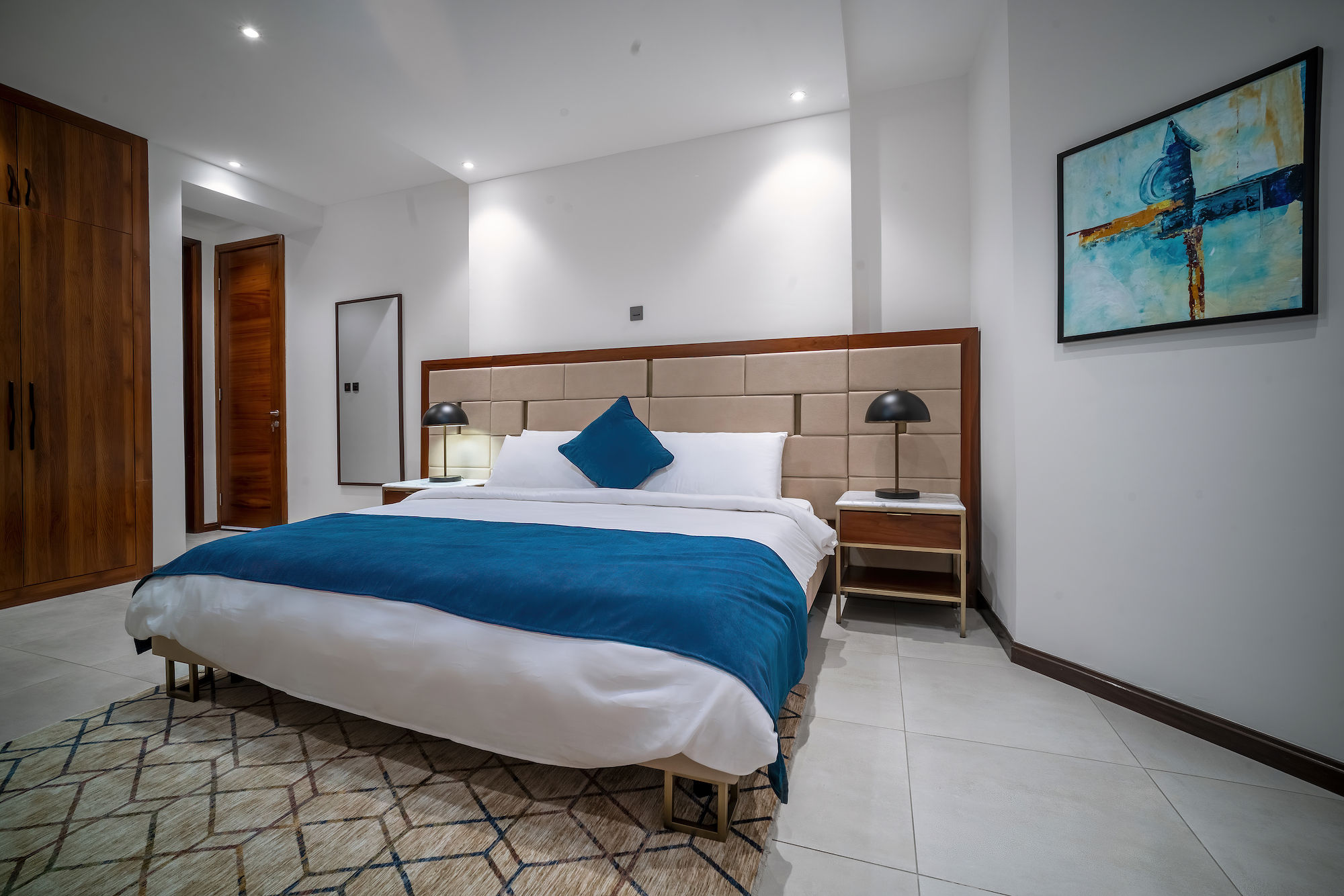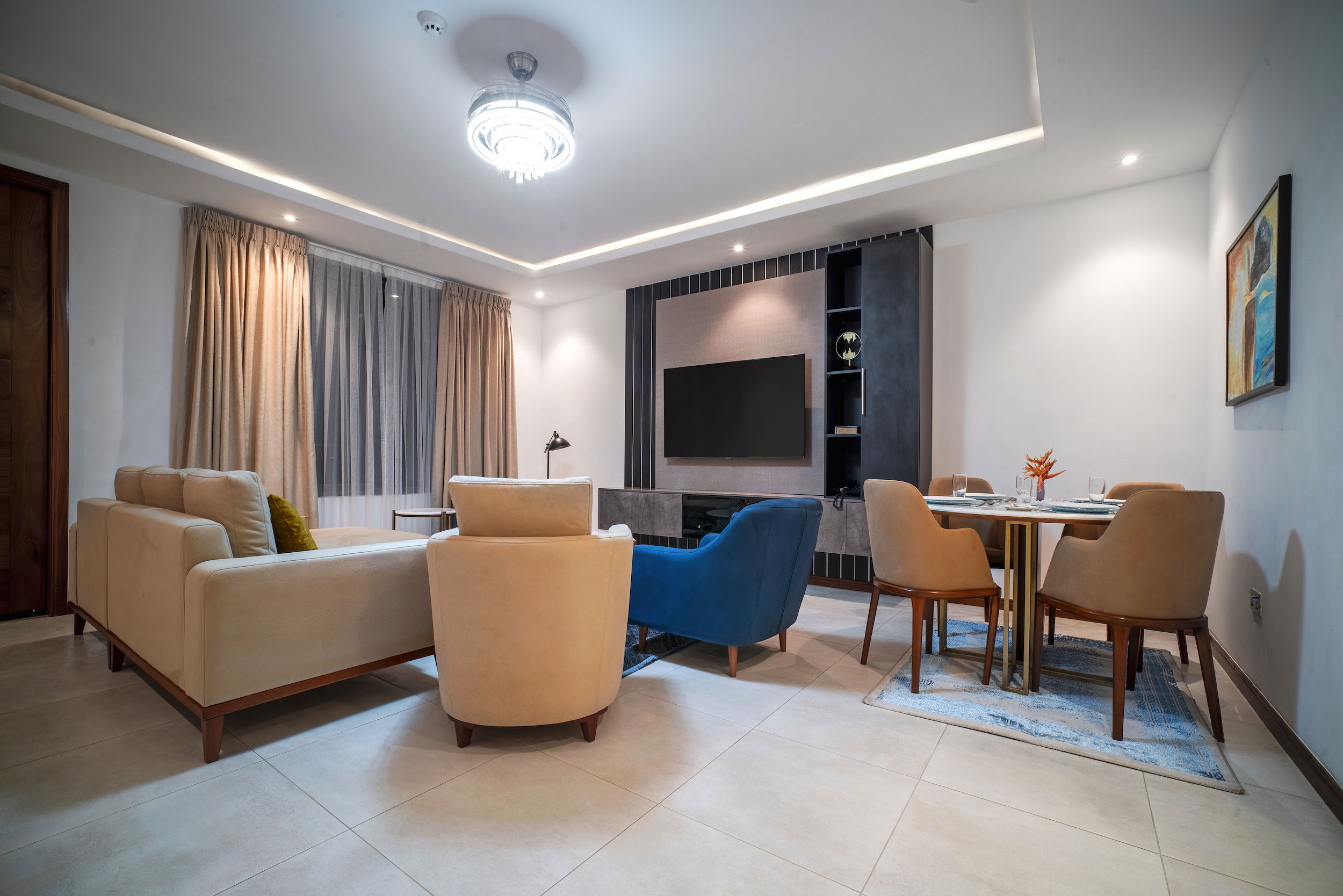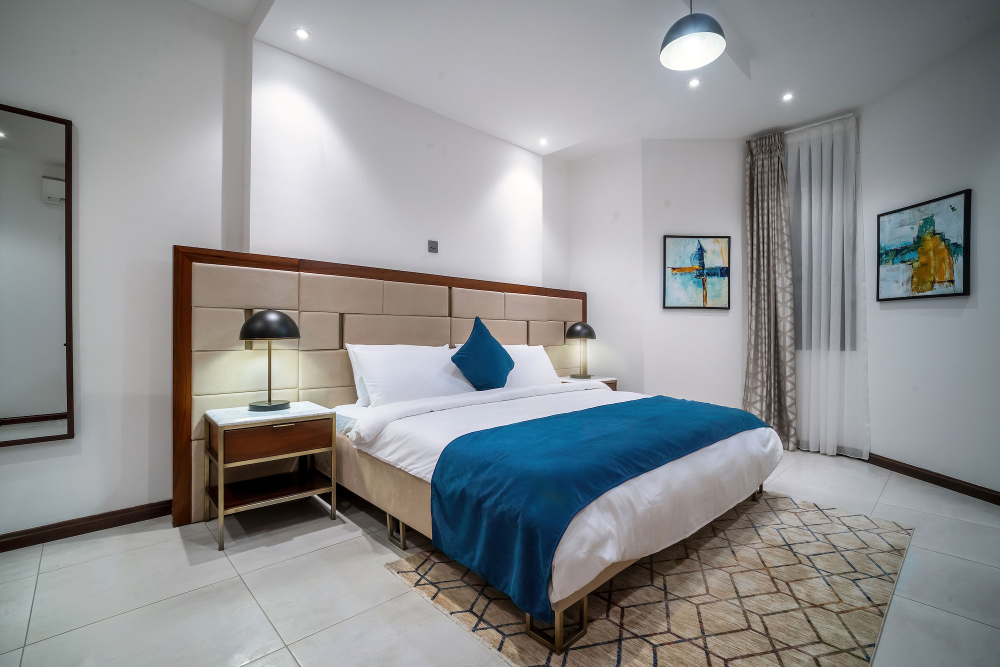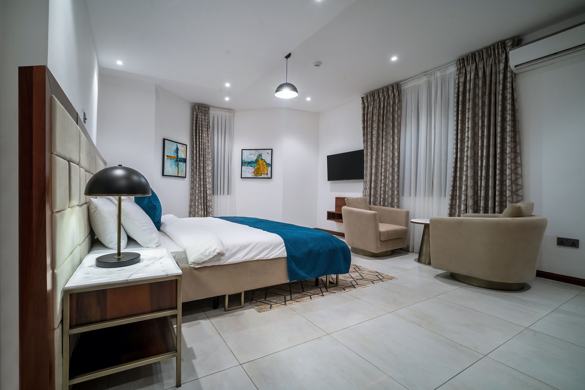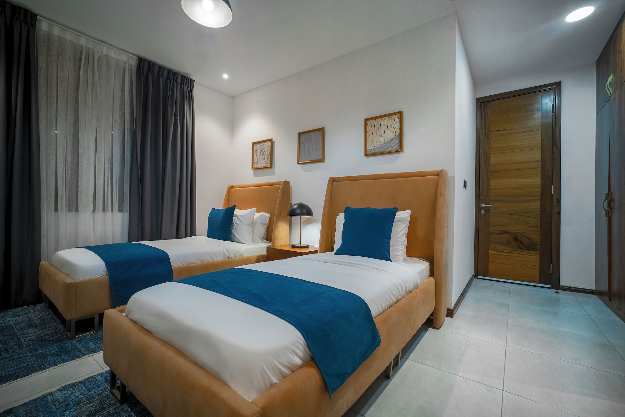 A three-bedroom apartment with a different executive suite bedroom that has a Queen size bed, a deluxe room with a double bed and a deluxe room with twin beds. It is fitted with a fully equipped ultra-modern kitchen and a huge living room and dining area for your family and friends. The apartment is fully air-conditioned with internet access, smart Tv, kitchen, fridge, Microwave, crockery, oven, stove, kettle, blender, washing machine, kitchen utensils, iron and ironing board, wardrobe, clothes hangers, toiletries, porch, and