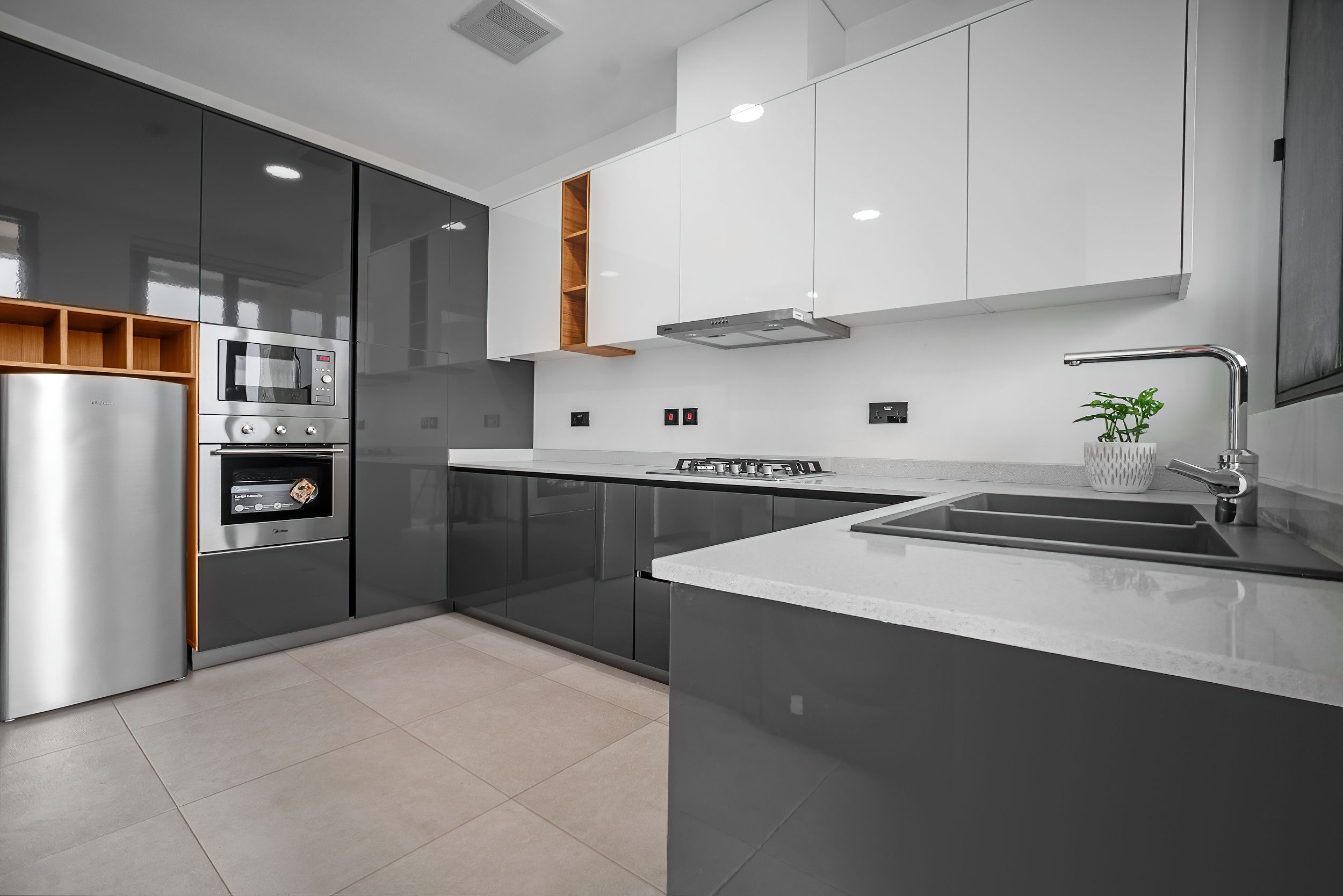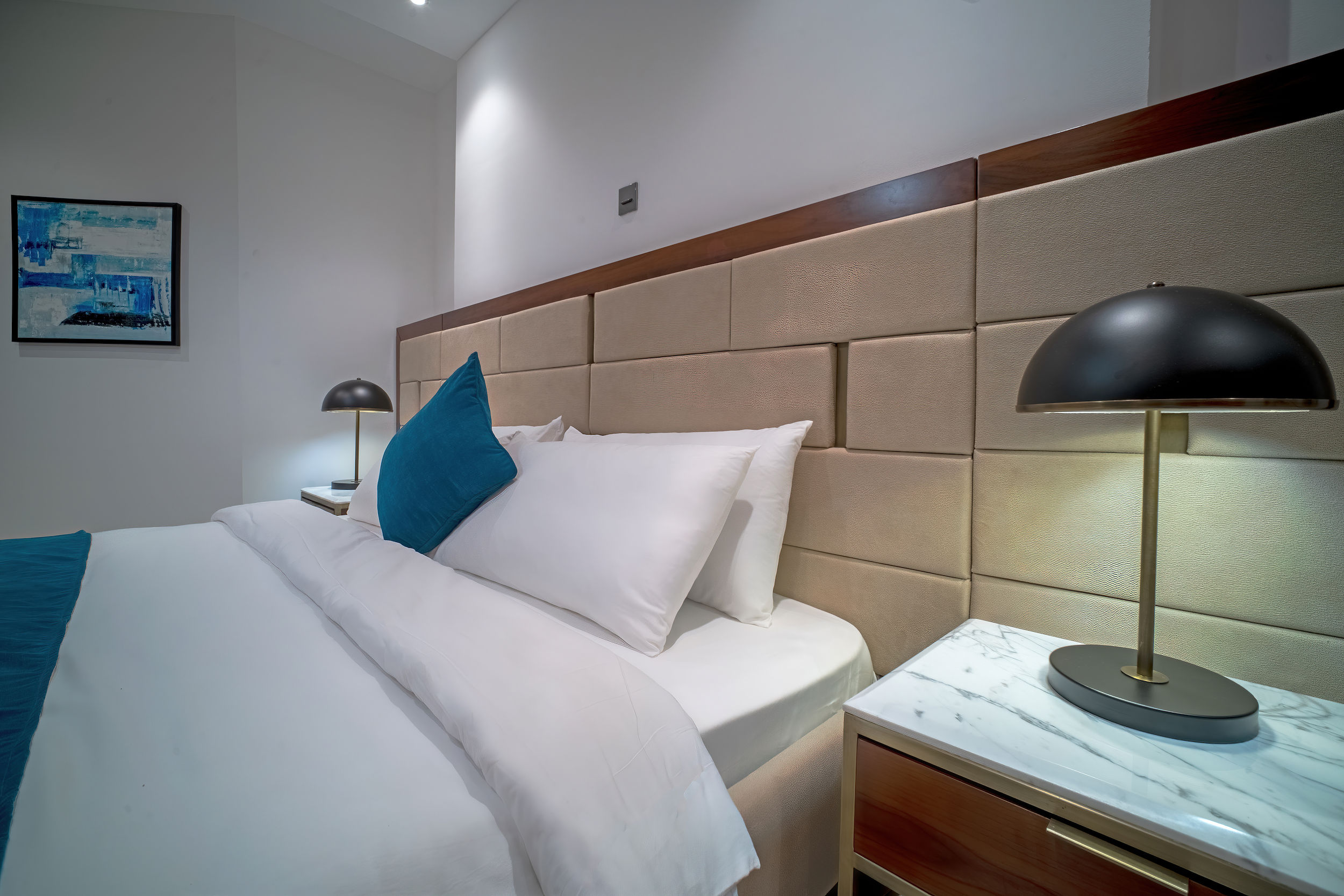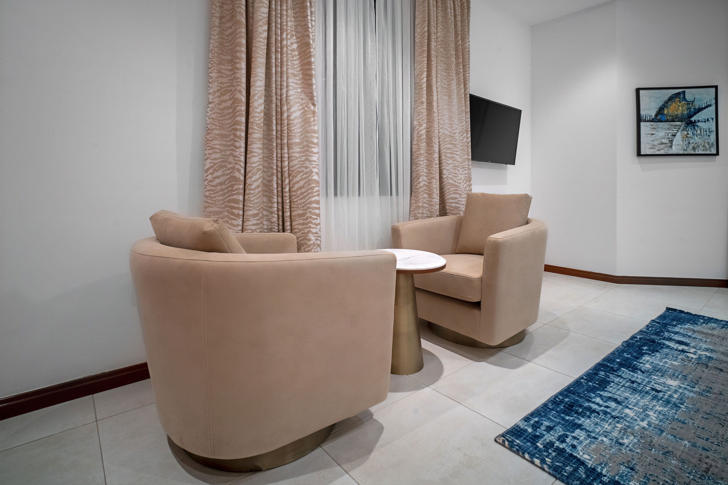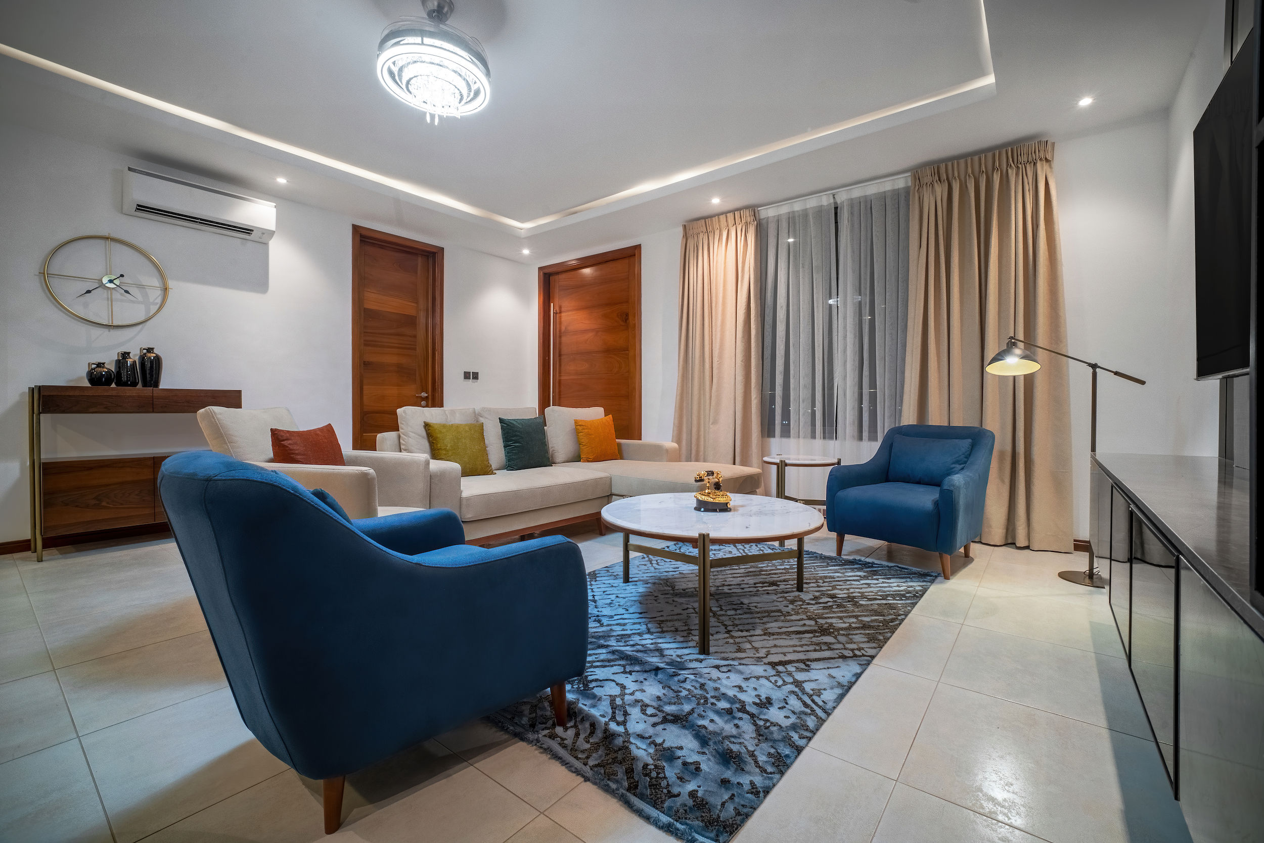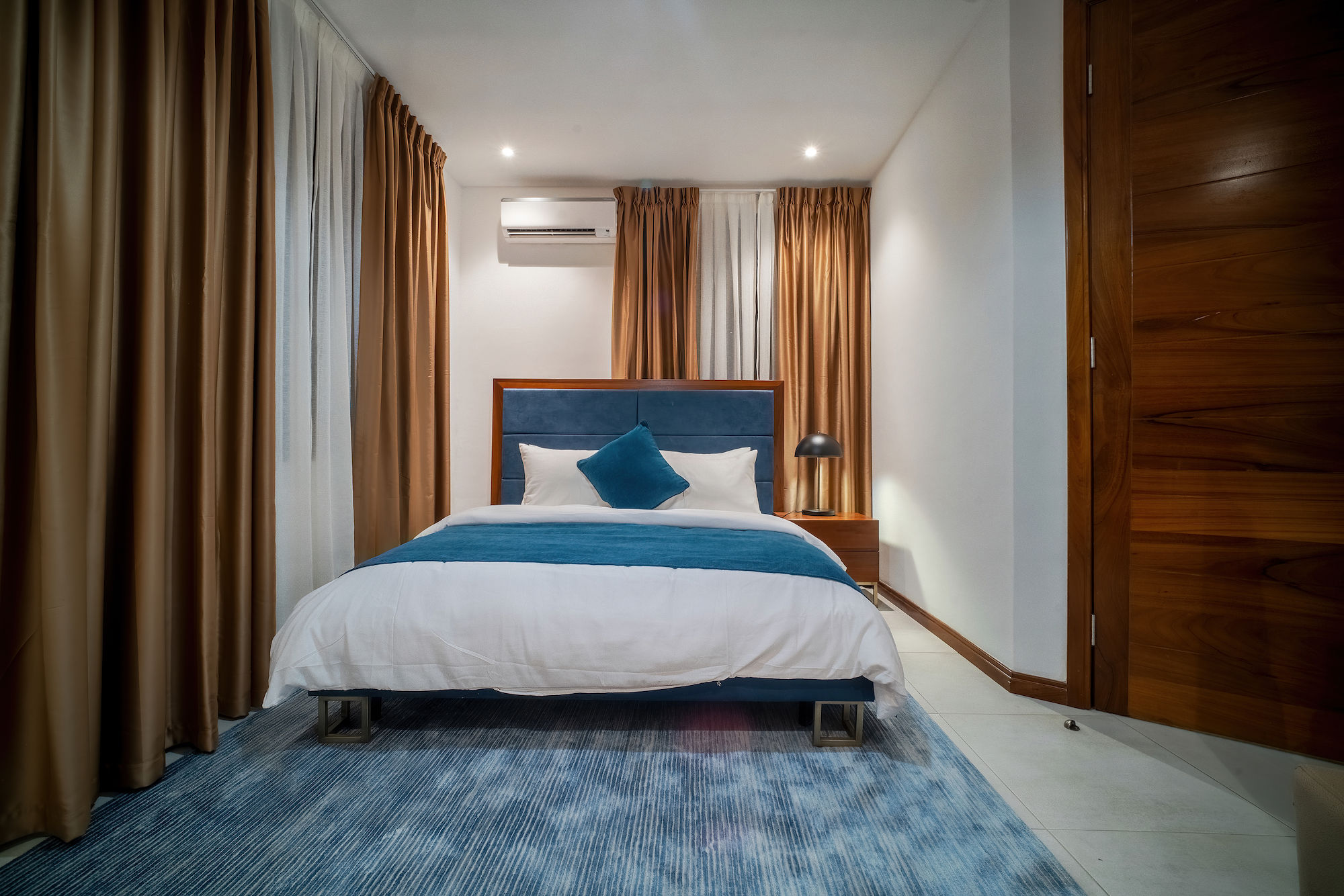 A three-bedroom apartment with a different executive suite bedroom that has a Queen size bed, a deluxe room with a double bed and a deluxe room with twin beds. It is fitted with a fully equipped ultra-modern kitchen and a huge living room and dining area for your family and friends. The apartment is fully air-conditioned with internet access, smart Tv, kitchen, fridge, Microwave, crockery, oven, stove, kettle, blender, washing machine, kitchen utensils, iron and ironing board, wardrobe, clothes hangers, toiletries, porch, and