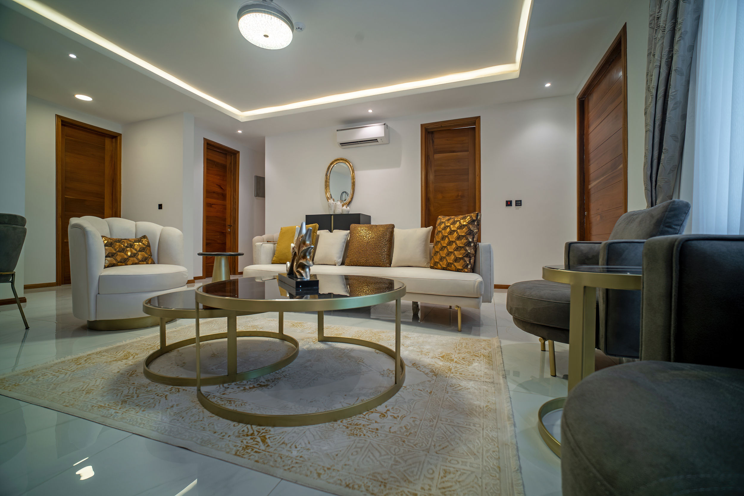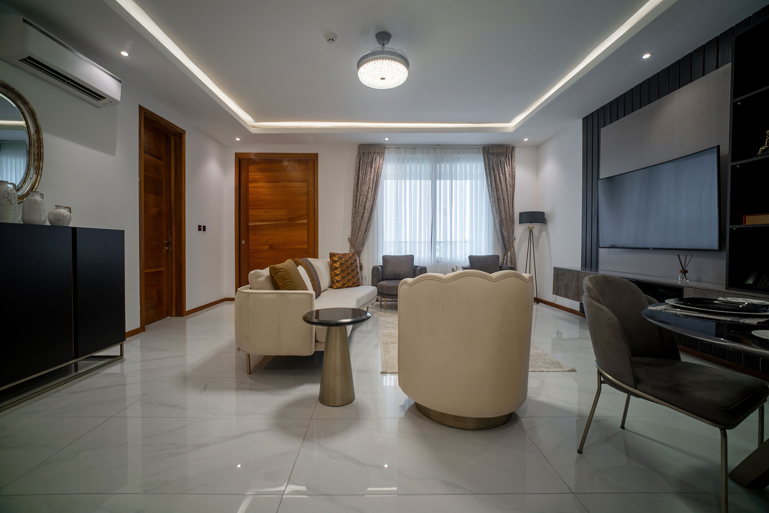 A three-bedroom apartment with a different executive suite bedroom that has a Queen size bed, a deluxe room with a double bed and a deluxe room with twin beds. It is fitted with a fully equipped ultra-modern kitchen and a huge living room and dining area for your family and friends. The apartment is fully air-conditioned with internet access, smart Tv, kitchen, fridge, Microwave, crockery, oven, stove, kettle, blender, washing machine, kitchen utensils, iron and ironing board, wardrobe, clothes hangers, toiletries, porch, and
