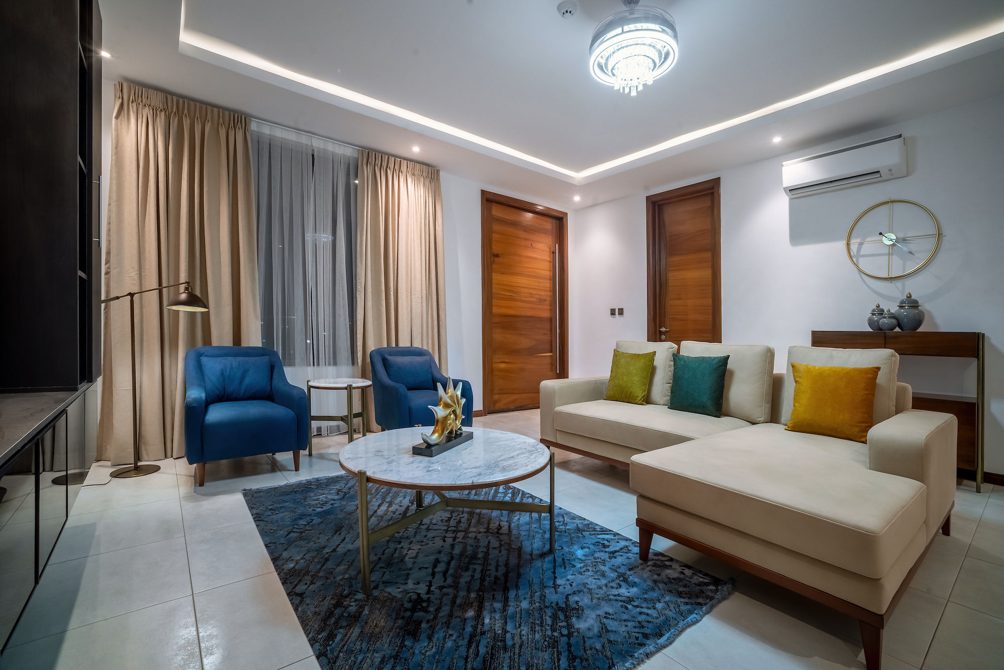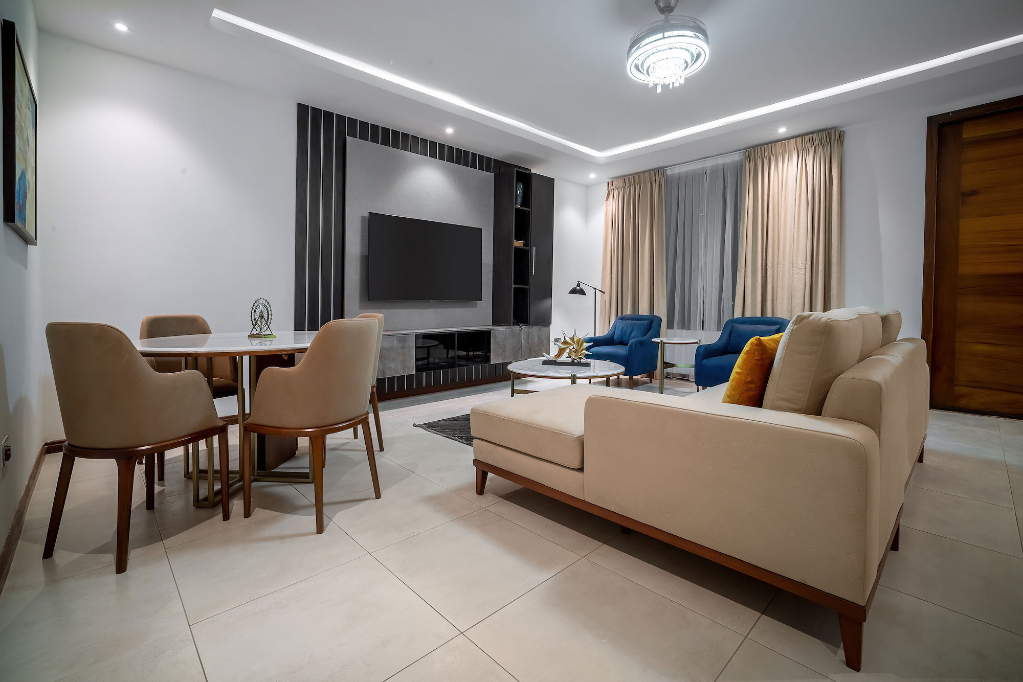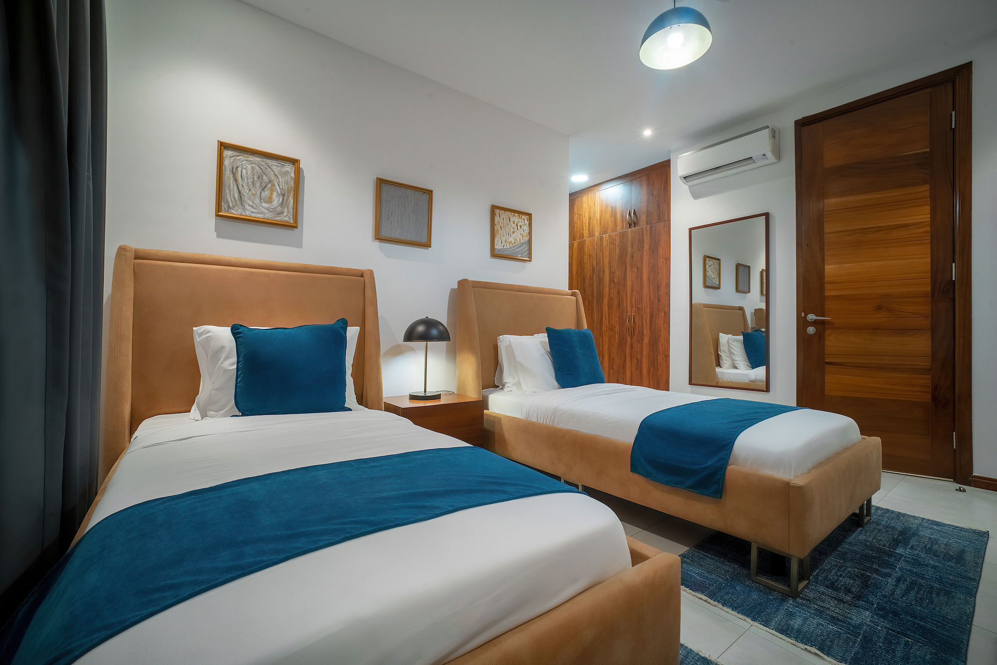 A three-bedroom apartment with a different executive suite bedroom that has a Queen size bed, a deluxe room with a double bed and a deluxe room with twin beds. It is fitted with a fully equipped ultra-modern kitchen and a huge living room and dining area for your family and friends. The apartment is fully air-conditioned with internet access, smart Tv, kitchen, fridge, Microwave, crockery, oven, stove, kettle, blender, washing machine, kitchen utensils, iron and ironing board, wardrobe, clothes hangers, toiletries, porch, and